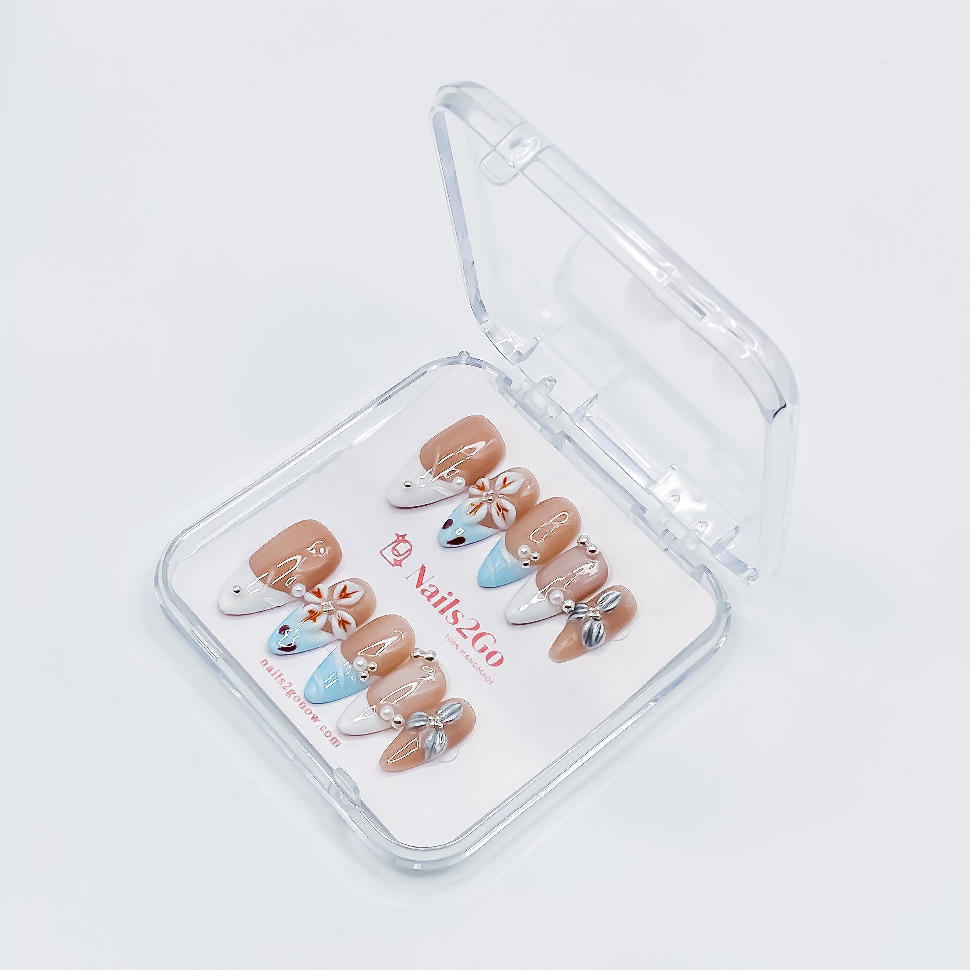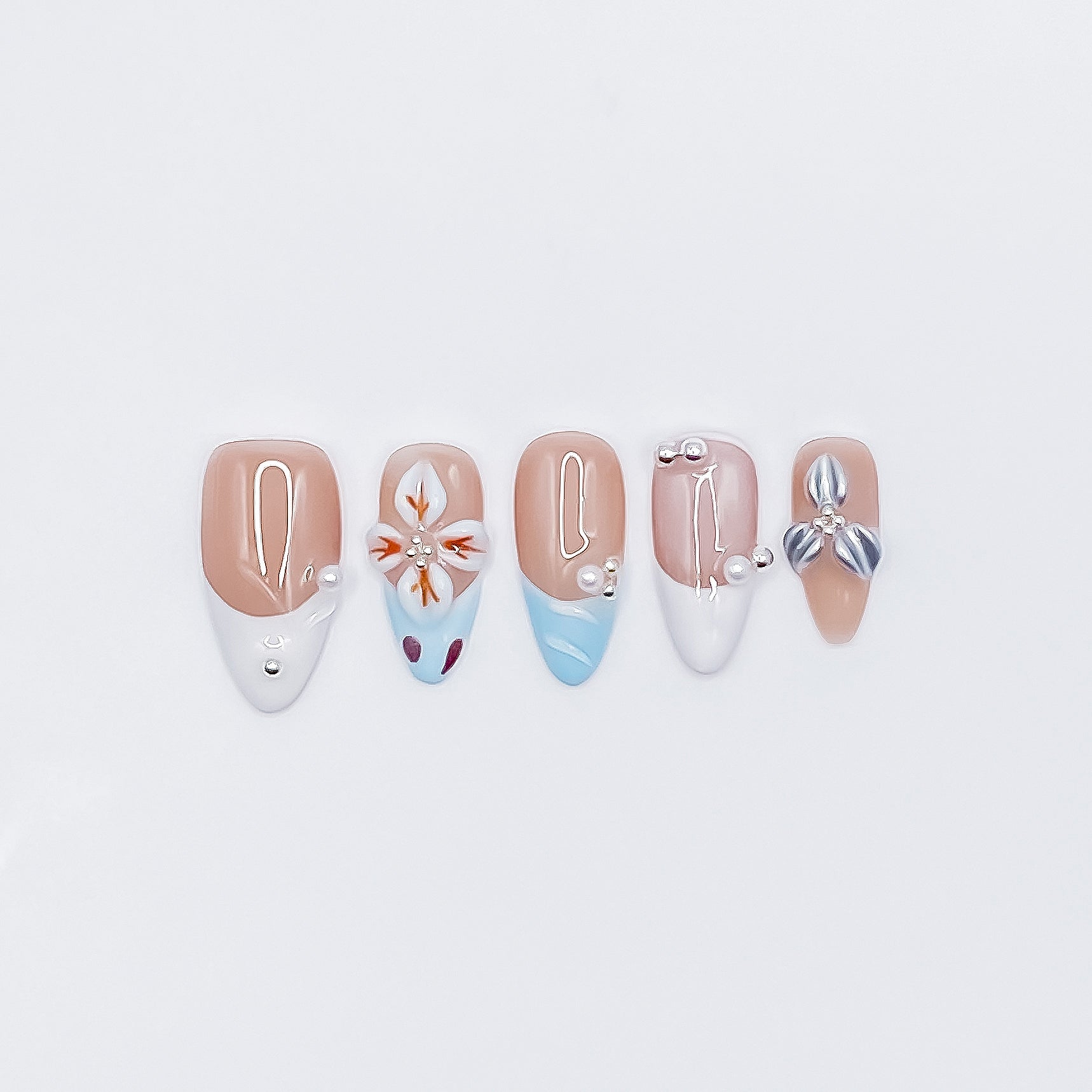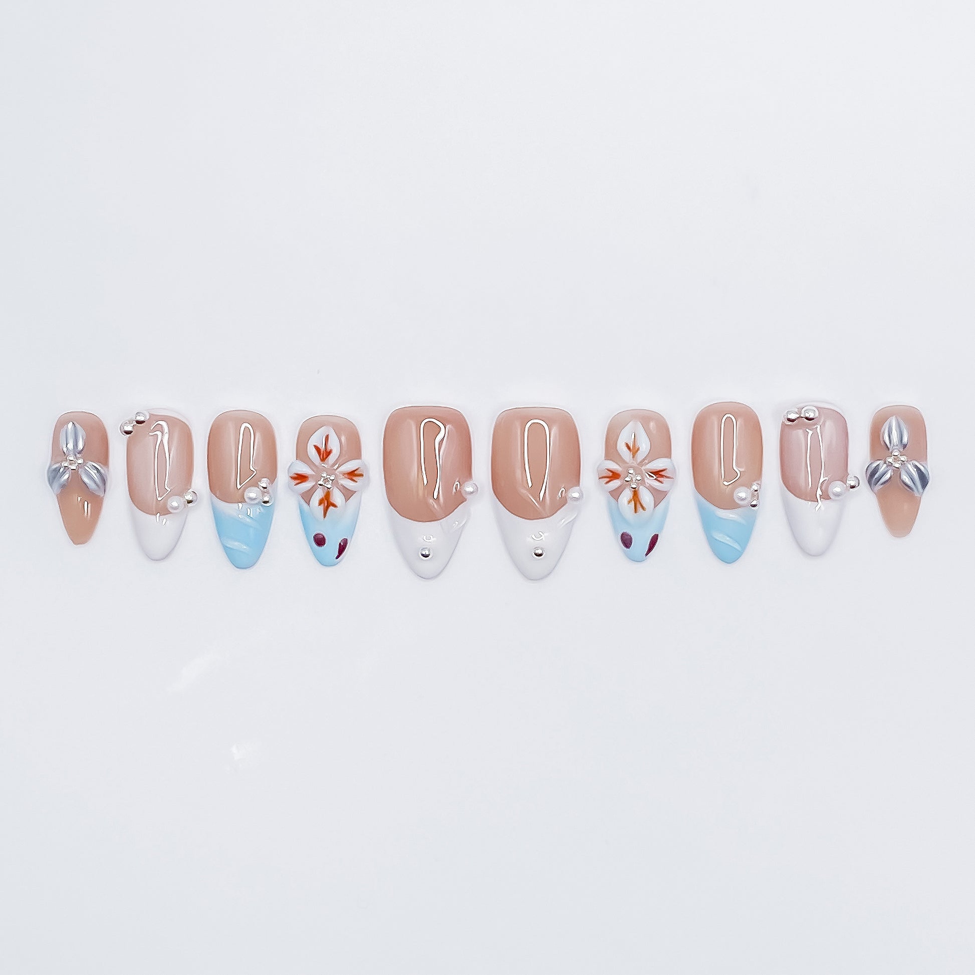 Introducing this elegant press - on nail set. Featuring a stiletto shape, it combines nude, white, and light blue tones. Adorned with 3D flowers, silver embellishments, and pearls, each nail has unique details. The glossy finish adds a touch of sophistication. Perfect for those who love a delicate and stylish look, it brings a fresh and chic vibe to any occasion.