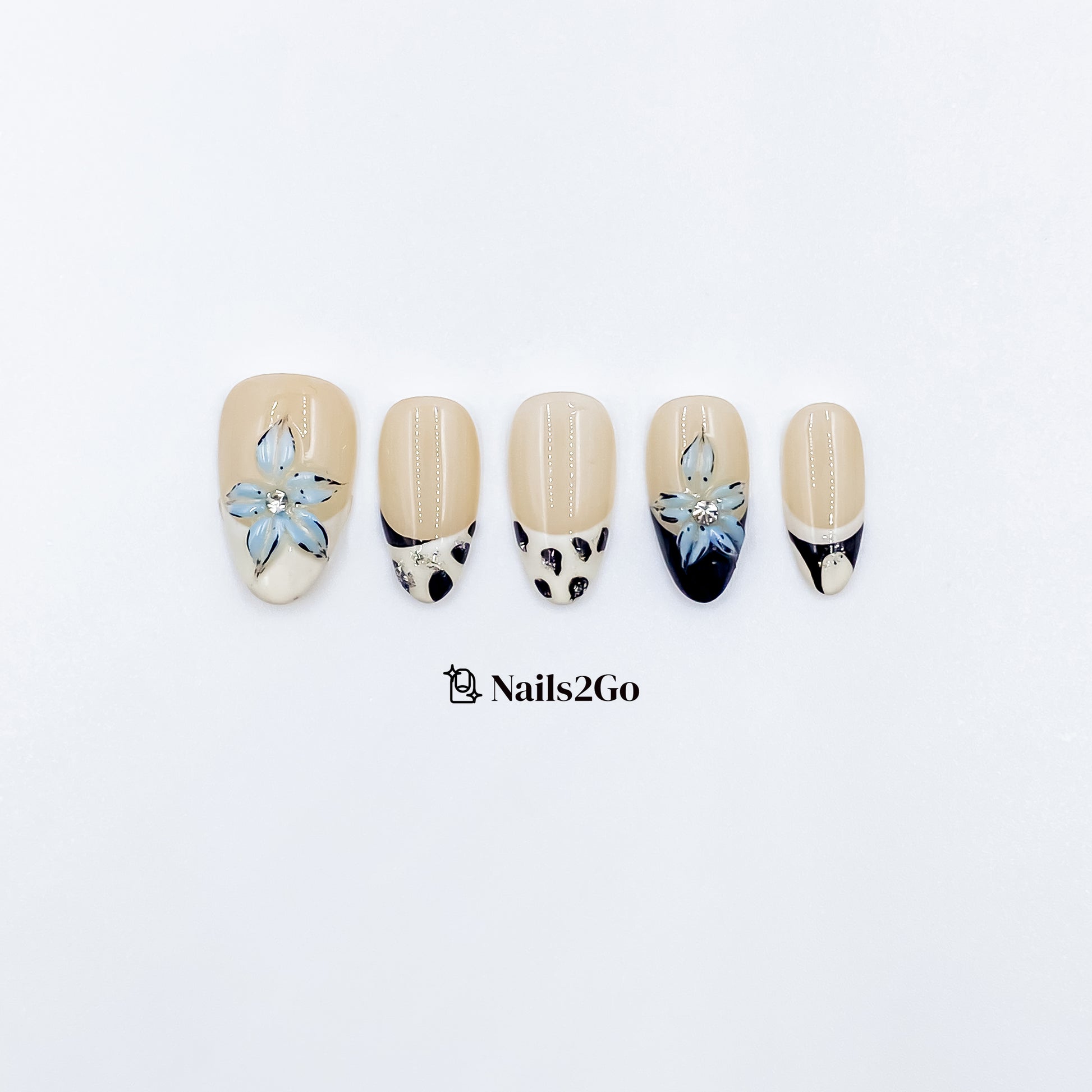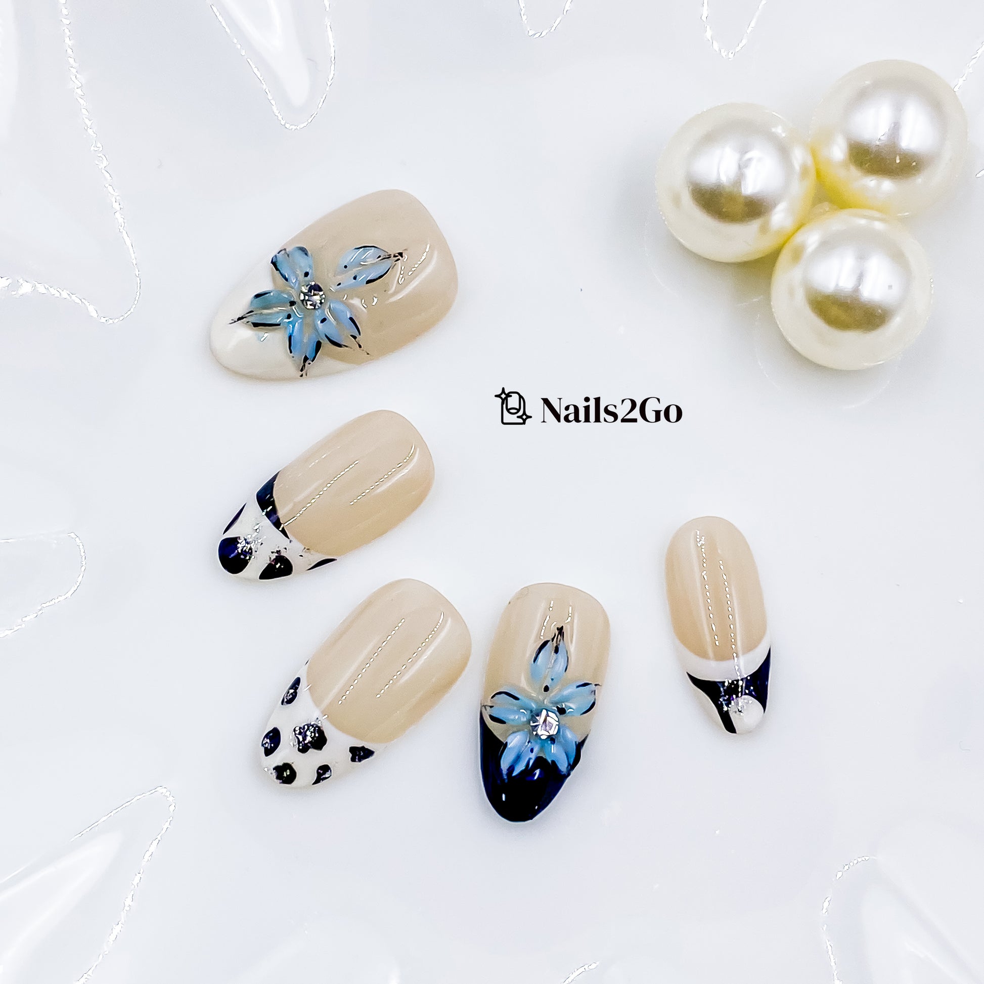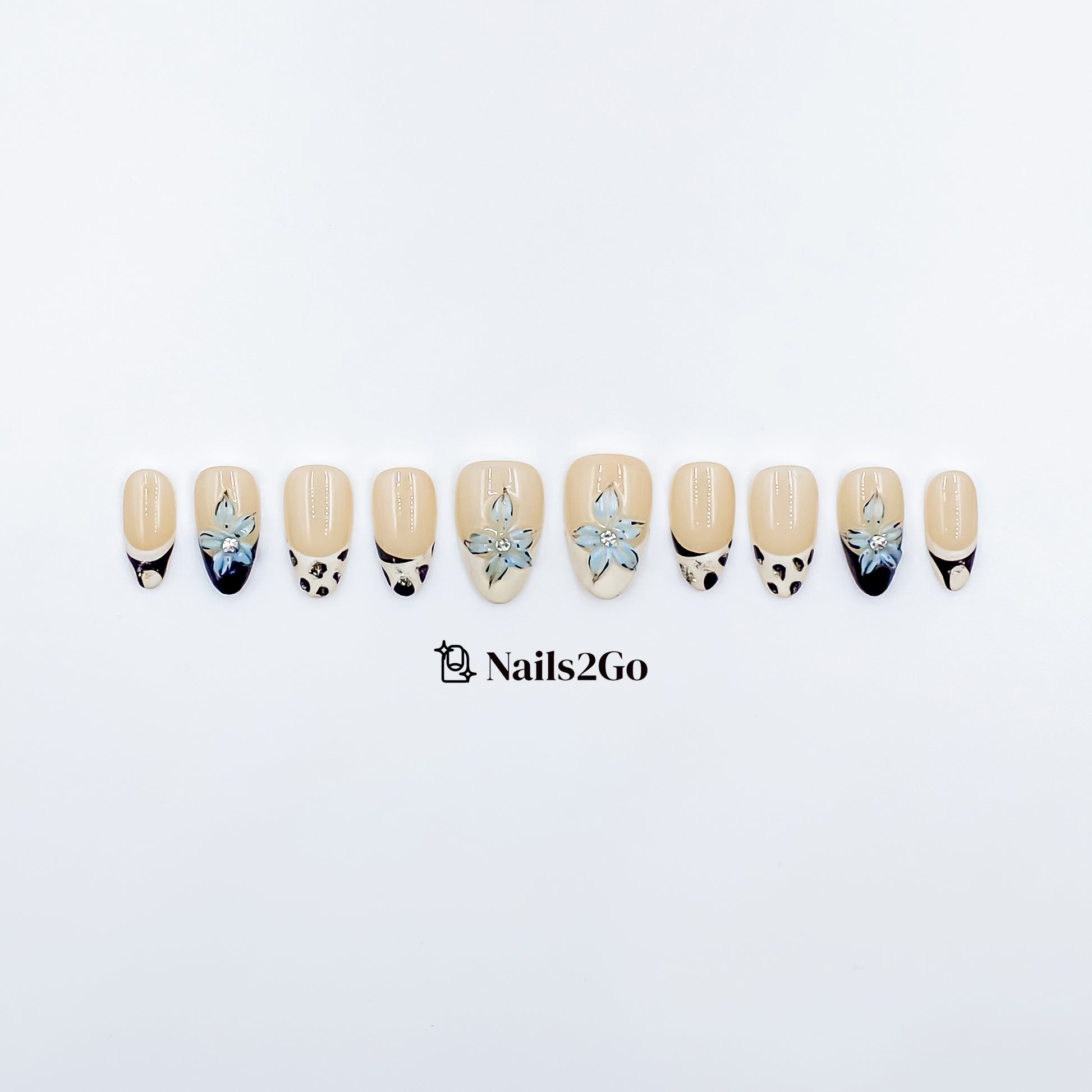 Unleash your inner wild with ‘Arctic Wild’ — a daring French tip with black-and-white animal print, icy blue 3D florals, and dazzling silver rhinestones. Bold, cool-toned, and wildly sophisticated.