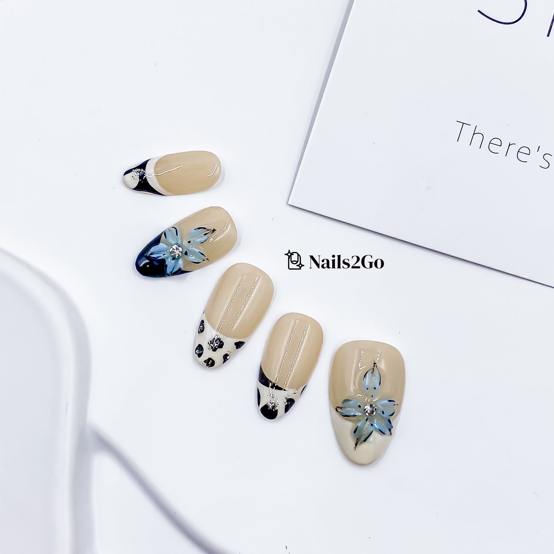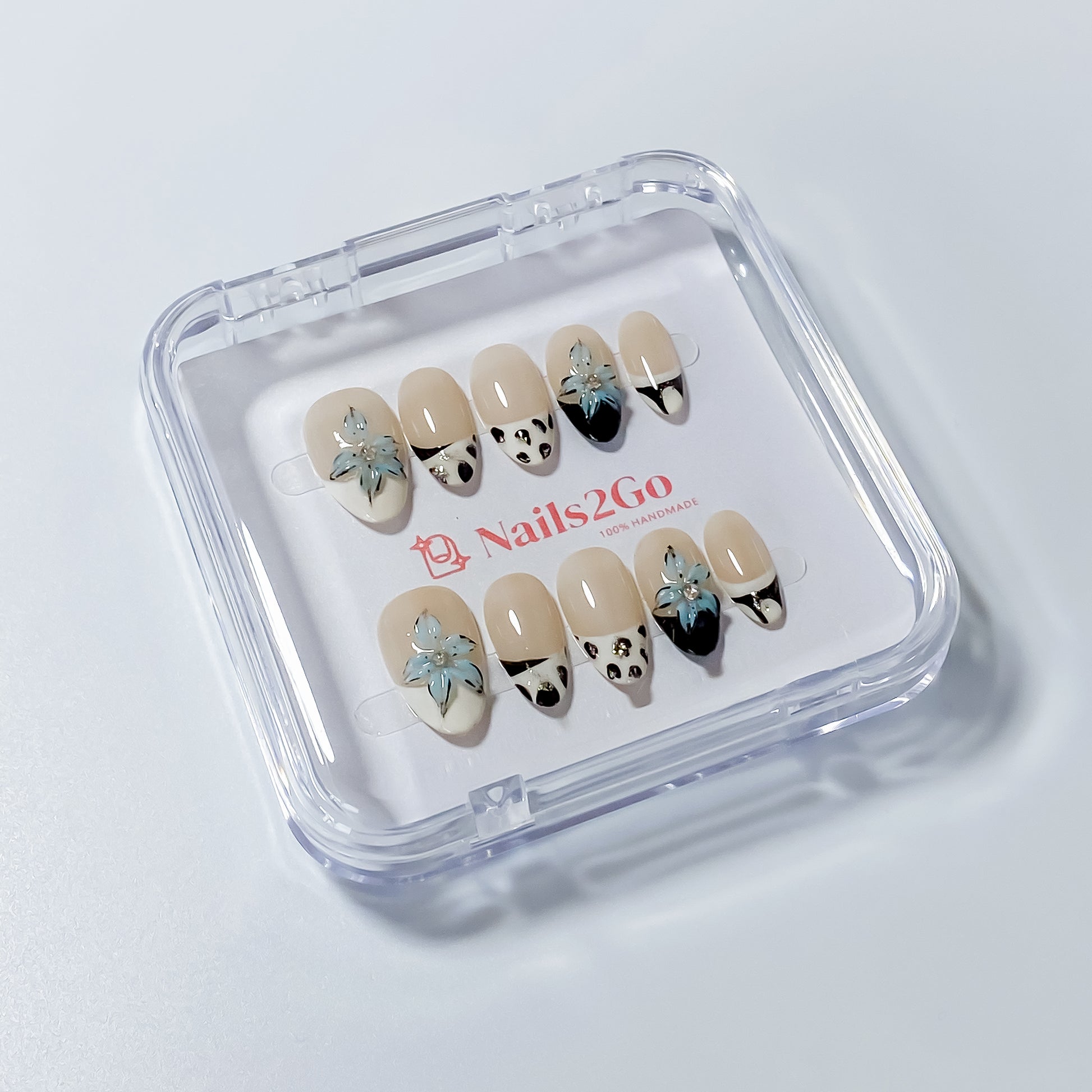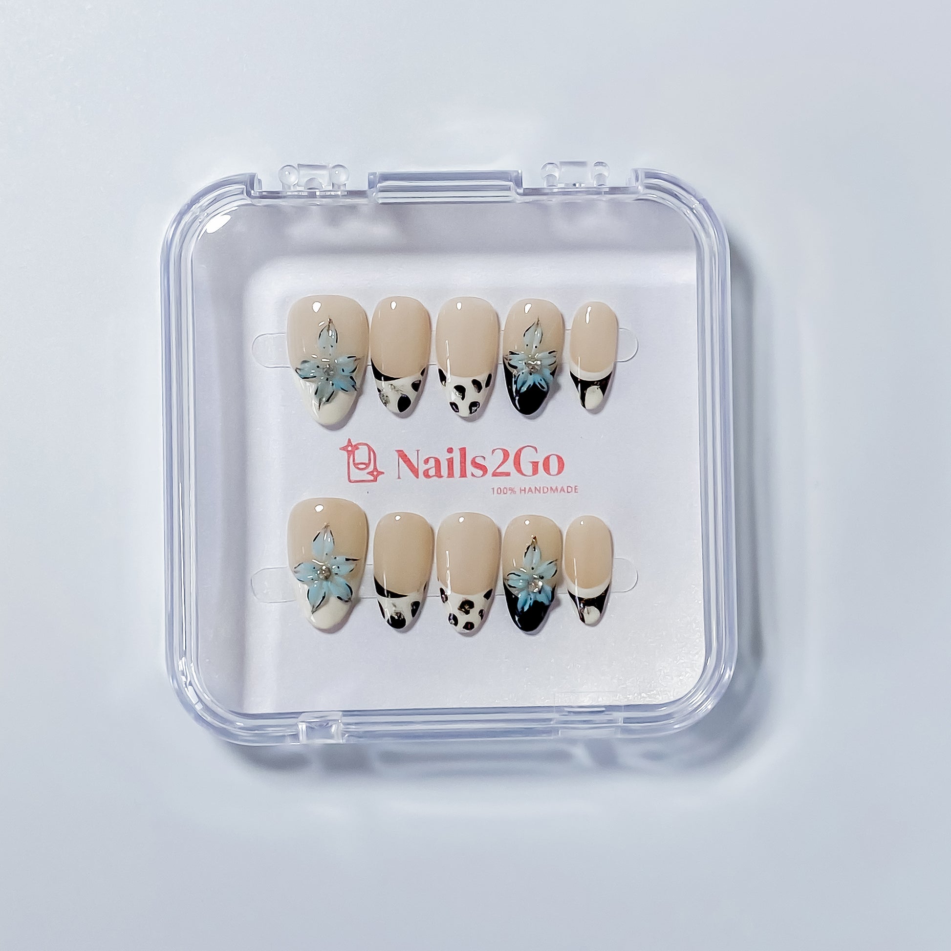 Unleash your inner wild with ‘Arctic Wild’ — a daring French tip with black-and-white animal print, icy blue 3D florals, and dazzling silver rhinestones. Bold, cool-toned, and wildly sophisticated.