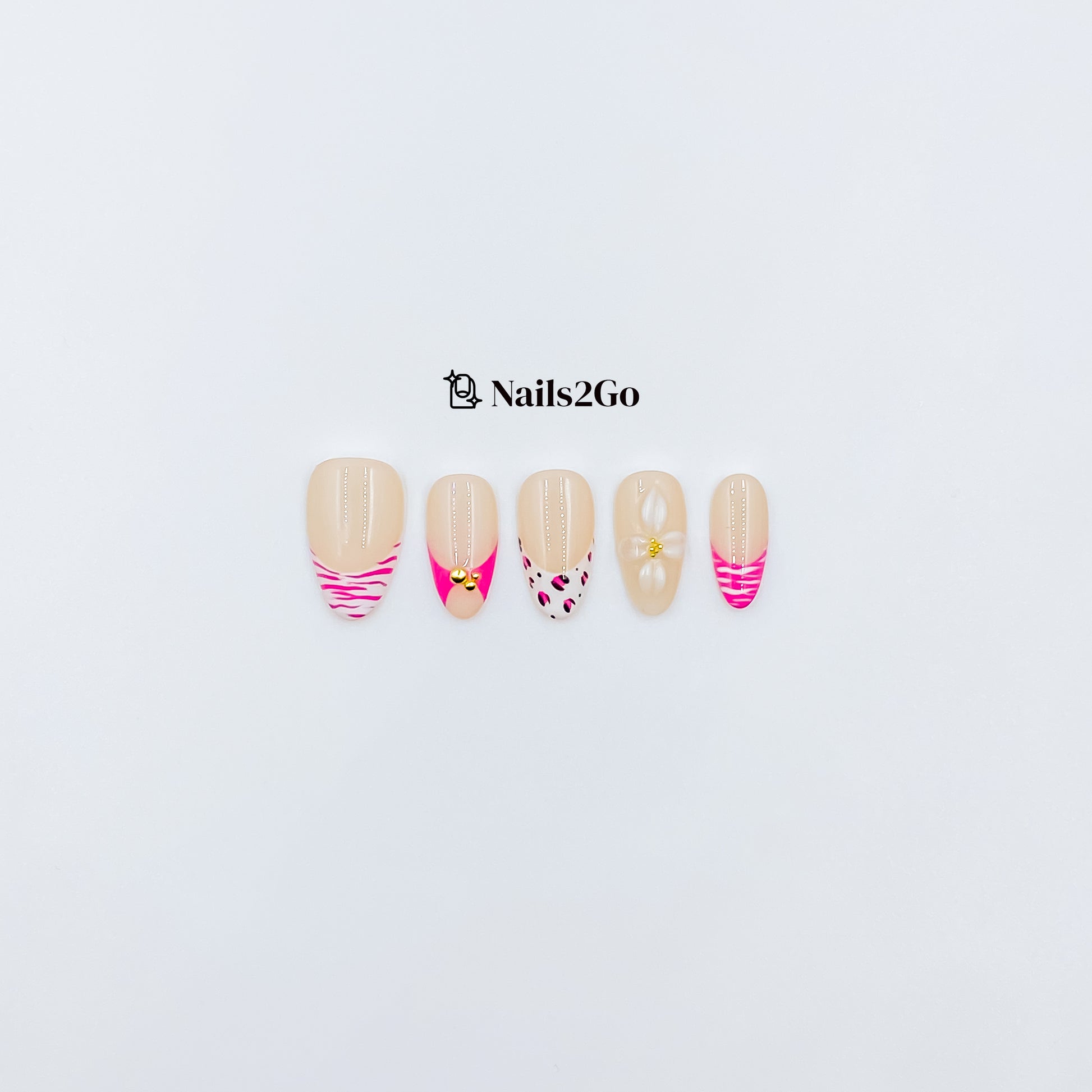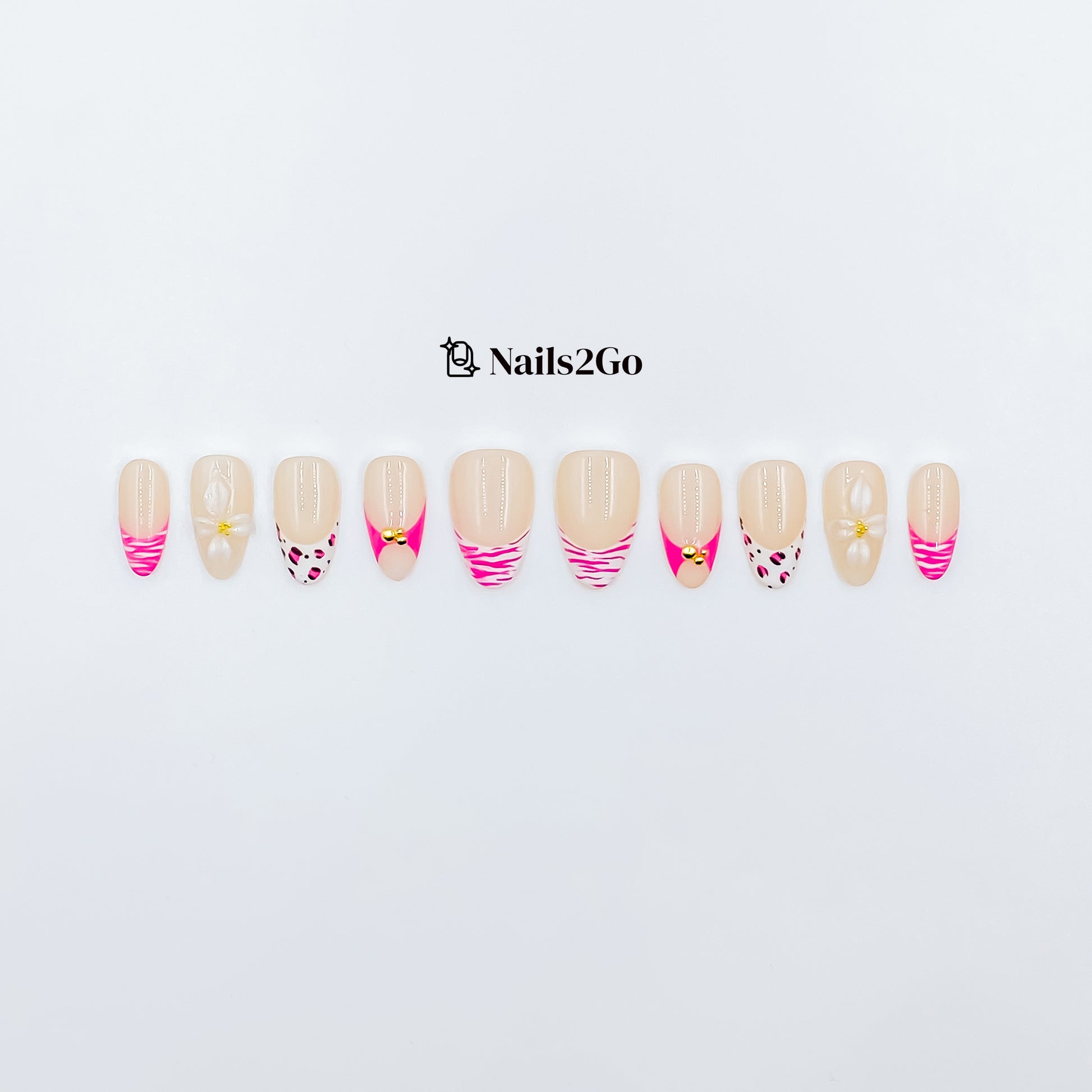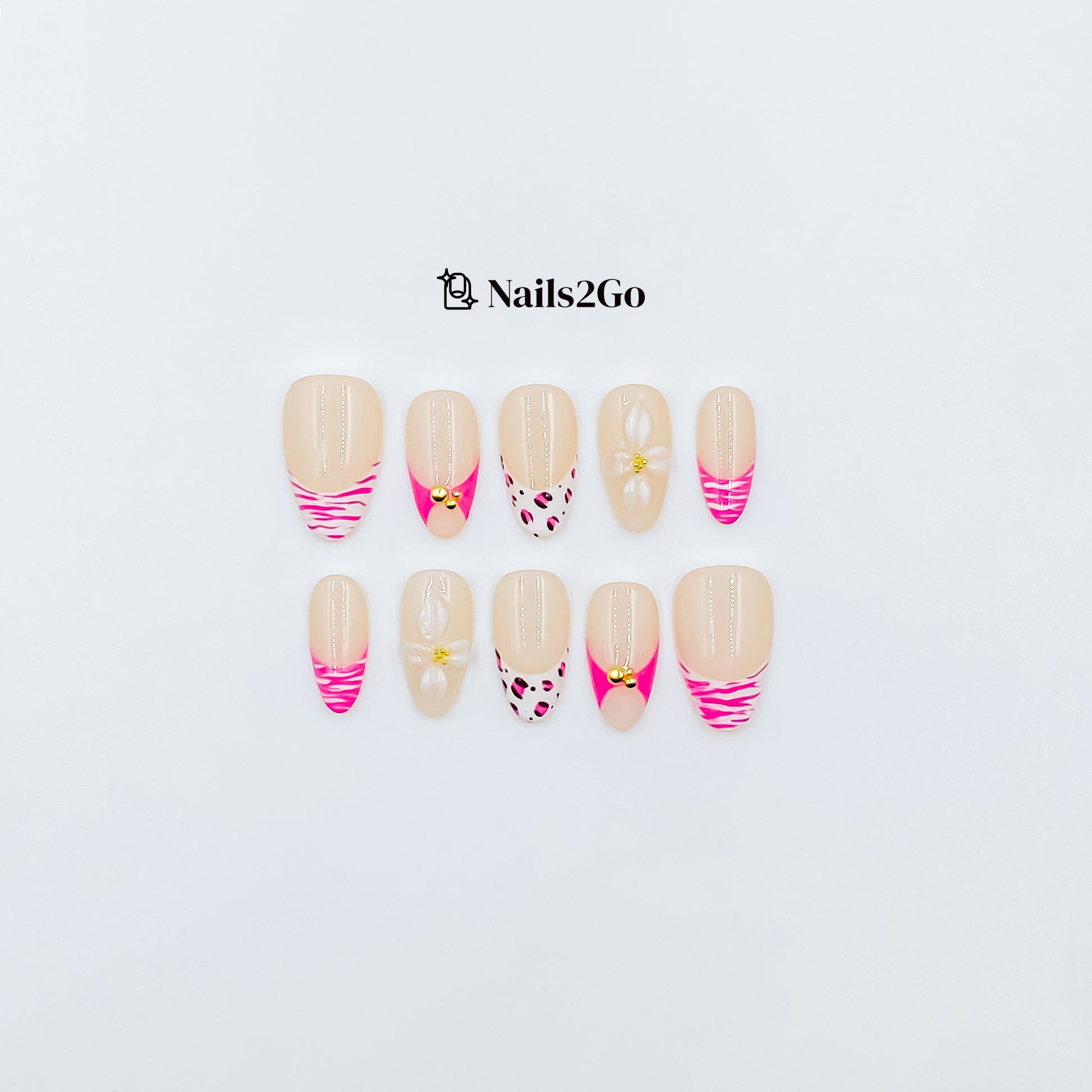 Where wild meets refined. 'Gilded Safari' blends hot pink drama, soft nude tones, and bold animal prints with delicate 3D florals and luxe gold embellishments. It’s feminine. It’s fierce. It’s everything.