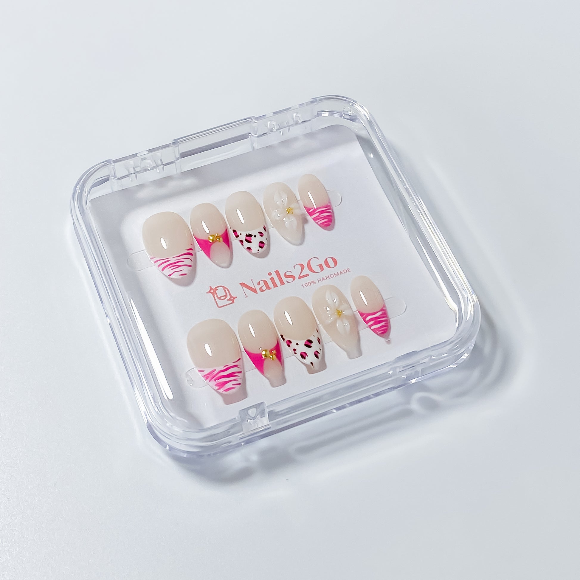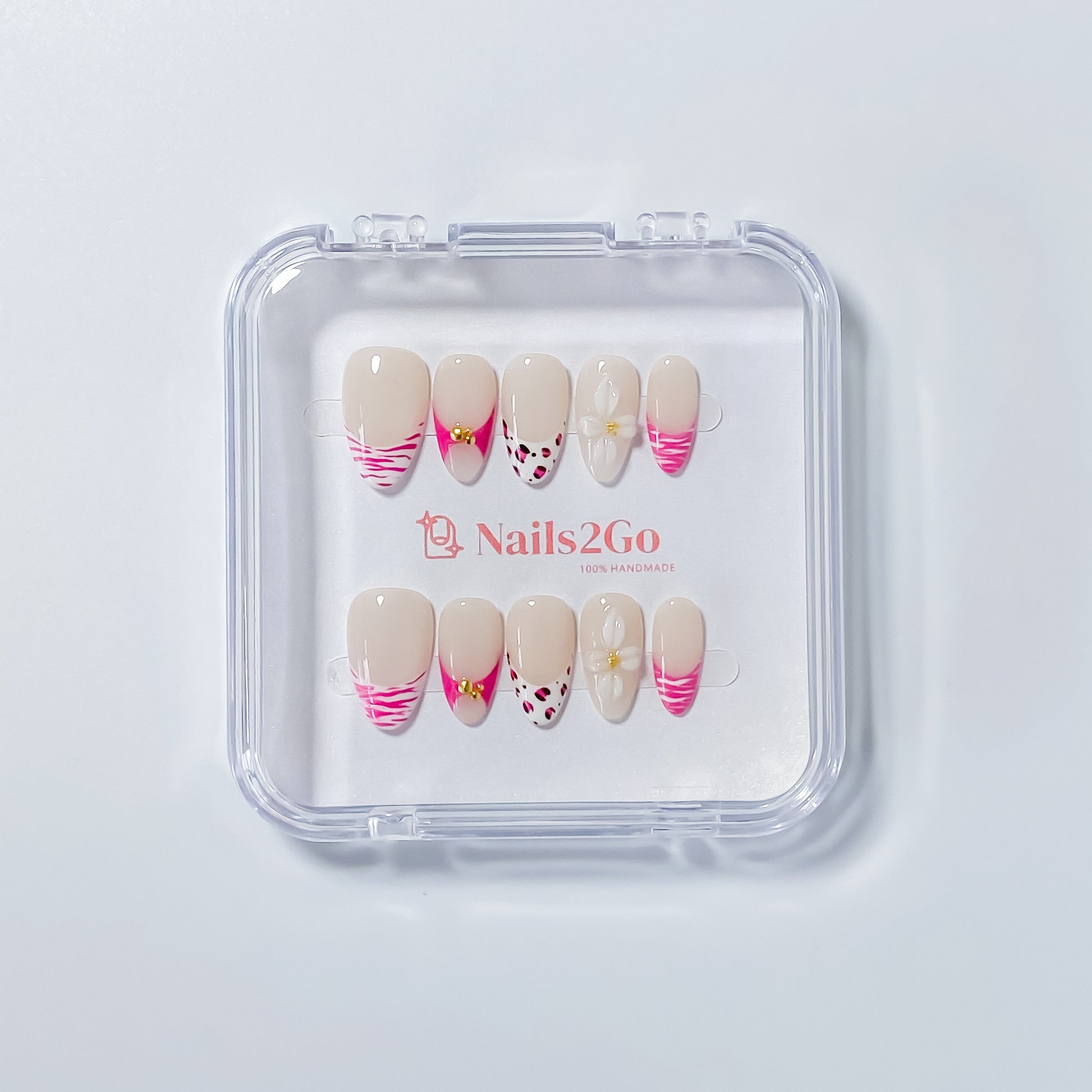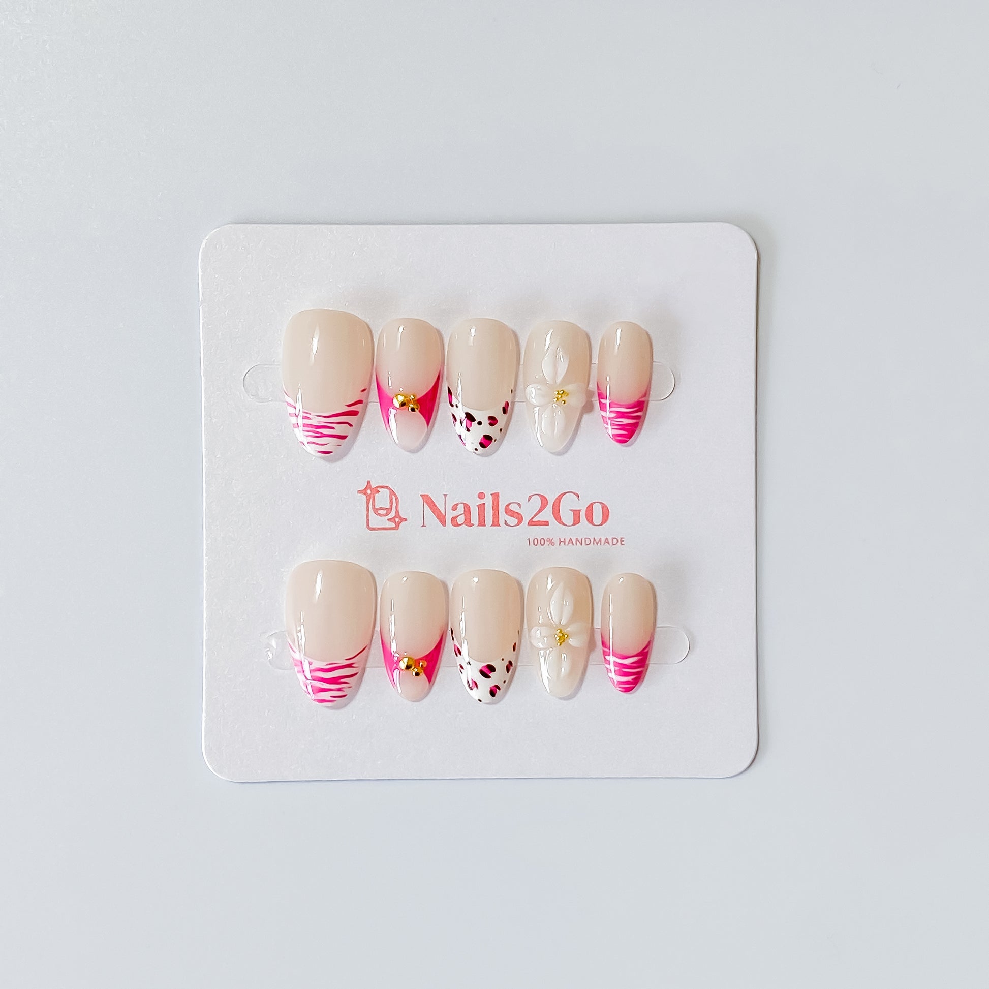 Where wild meets refined. 'Gilded Safari' blends hot pink drama, soft nude tones, and bold animal prints with delicate 3D florals and luxe gold embellishments. It’s feminine. It’s fierce. It’s everything.