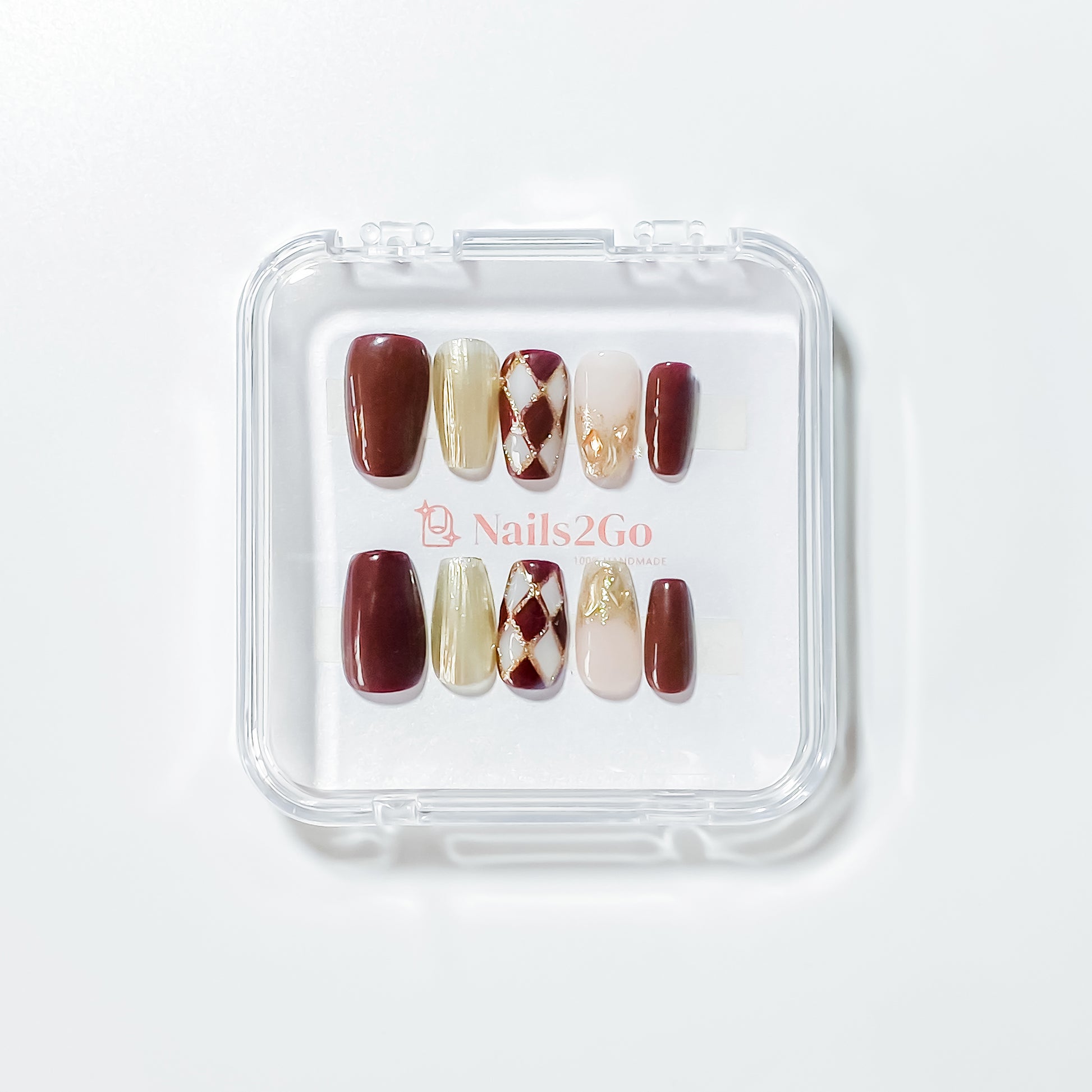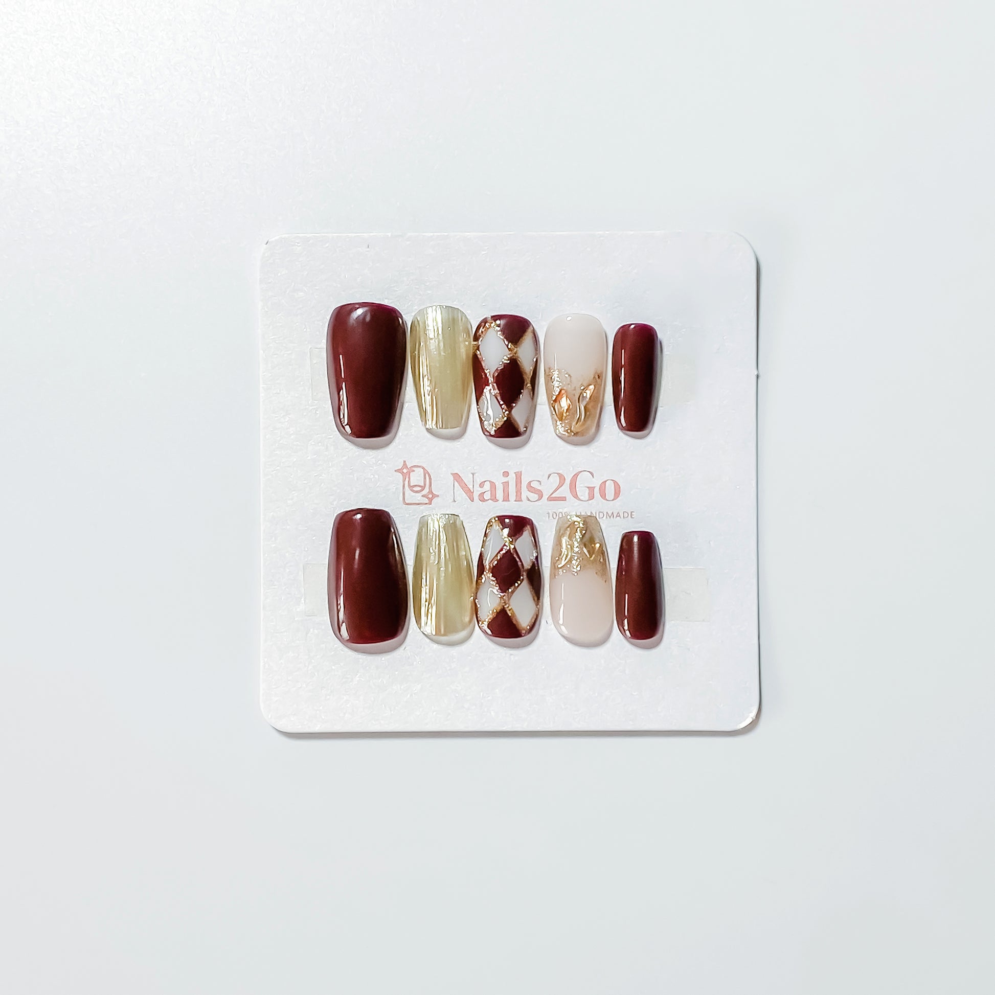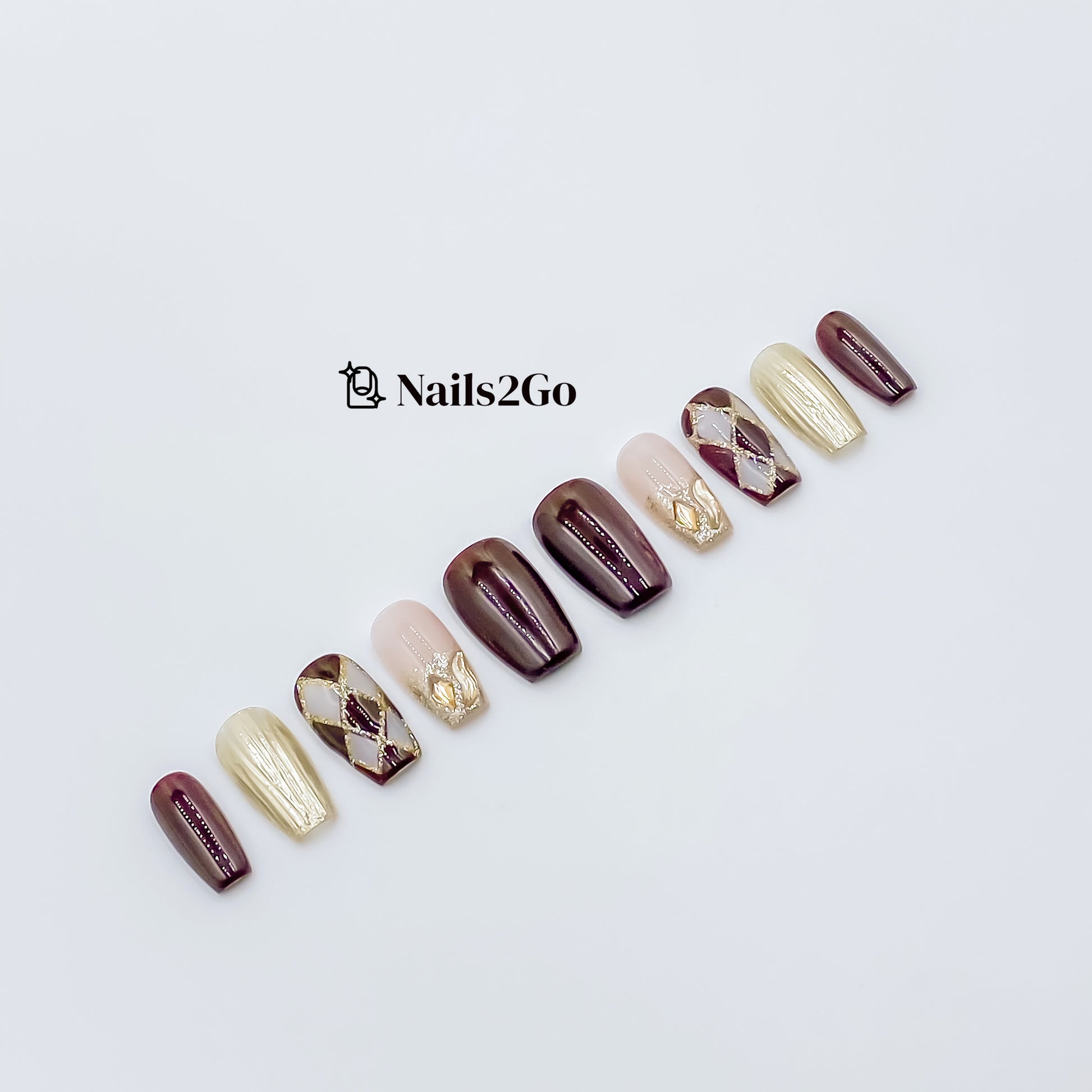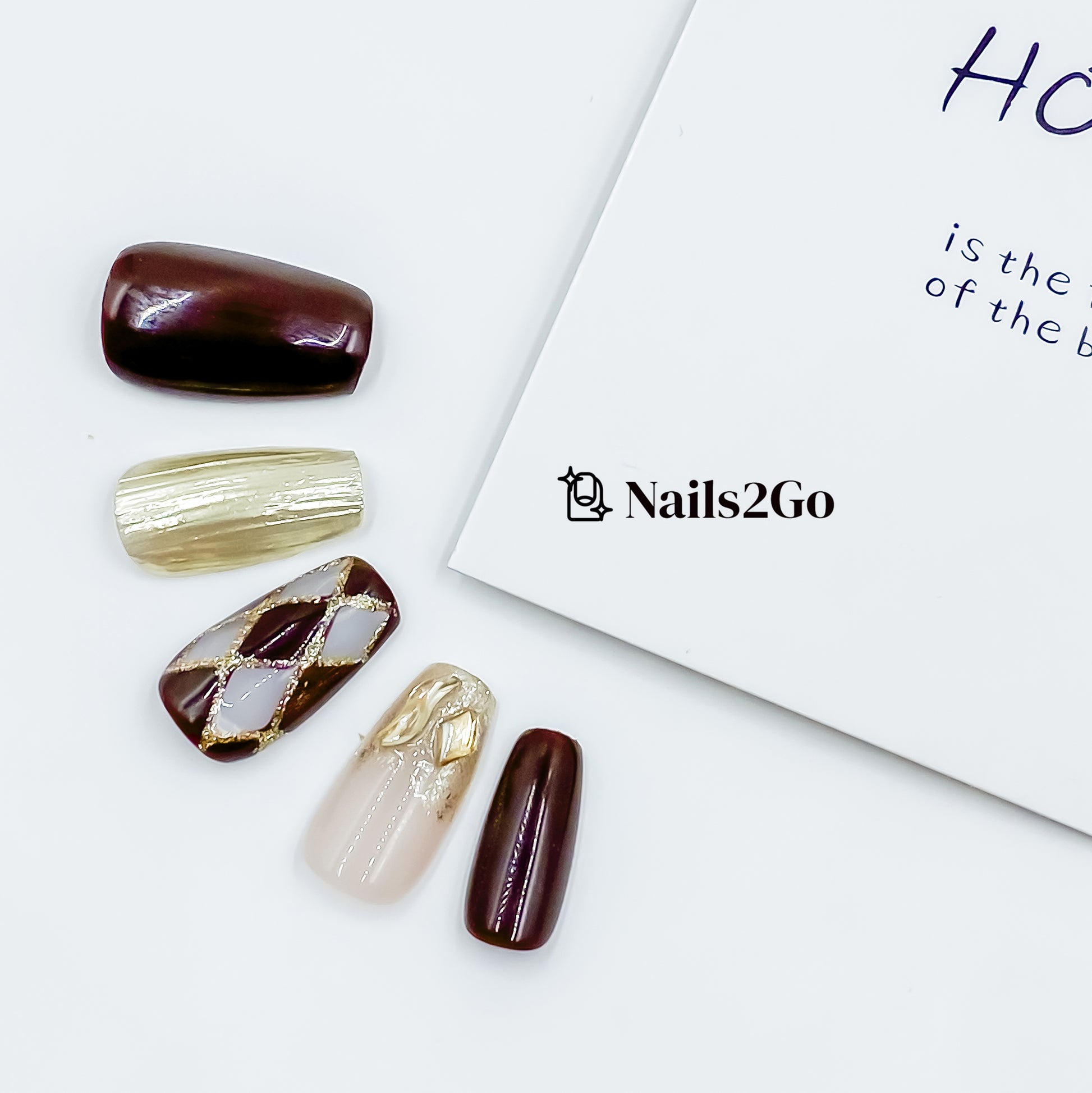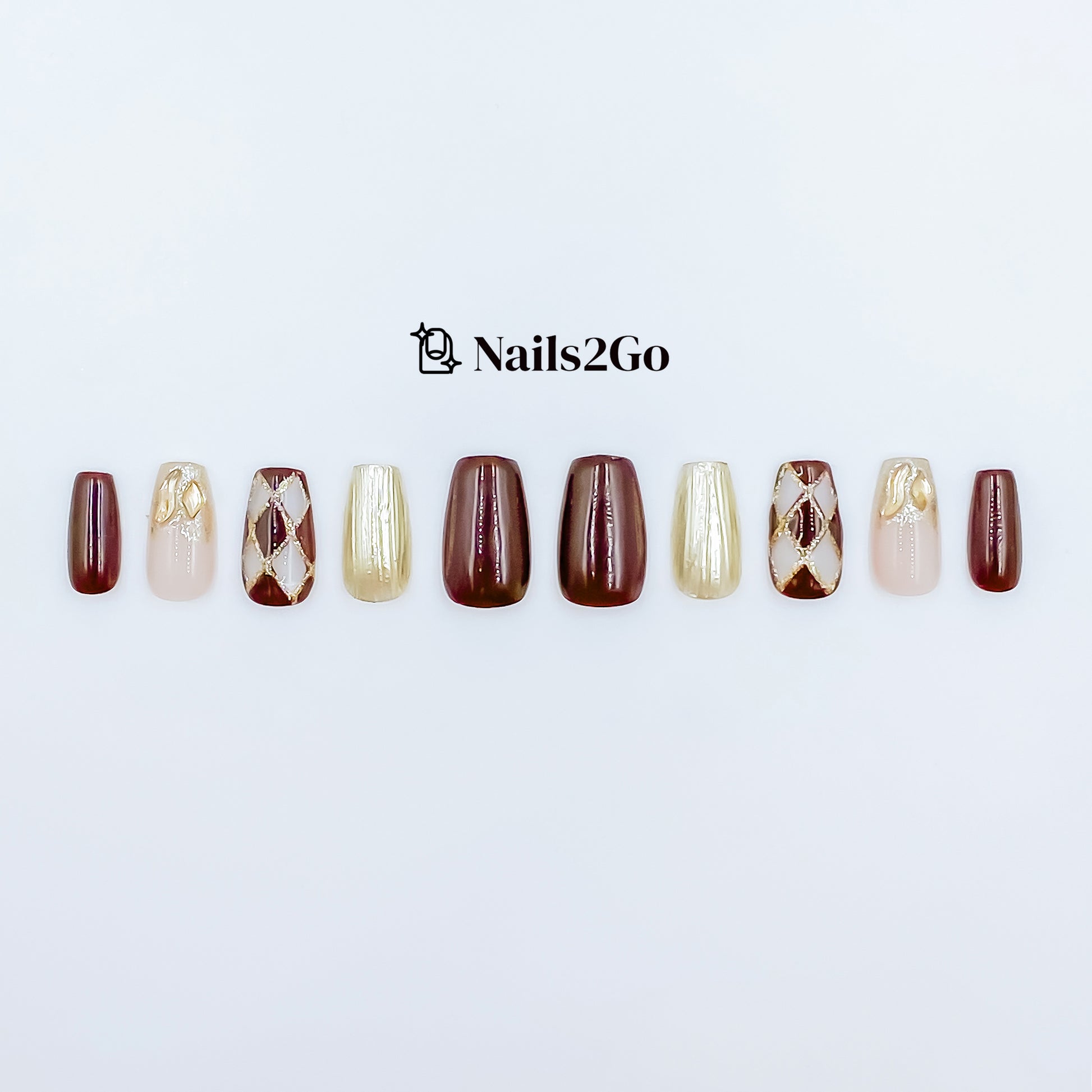 Golden Masquerade’ is a celebration of bold elegance — featuring deep brown and off-white tones, gleaming chromatic gold, glittering harlequin accents, and soft golden rhinestones. Luxe, luminous, and made to dazzle in every light.