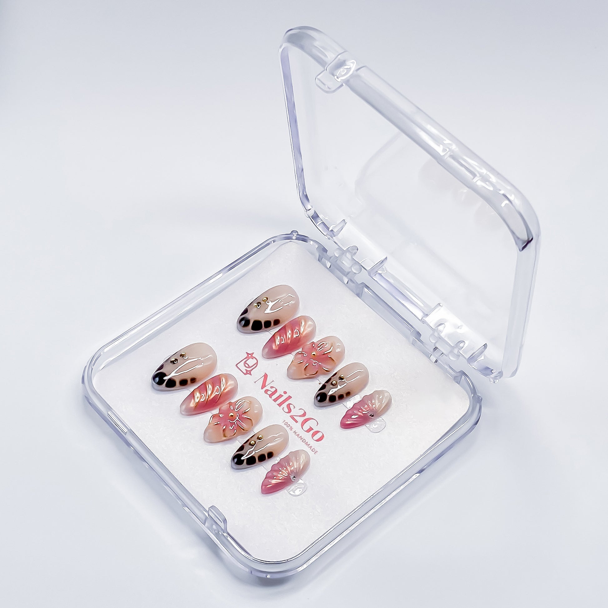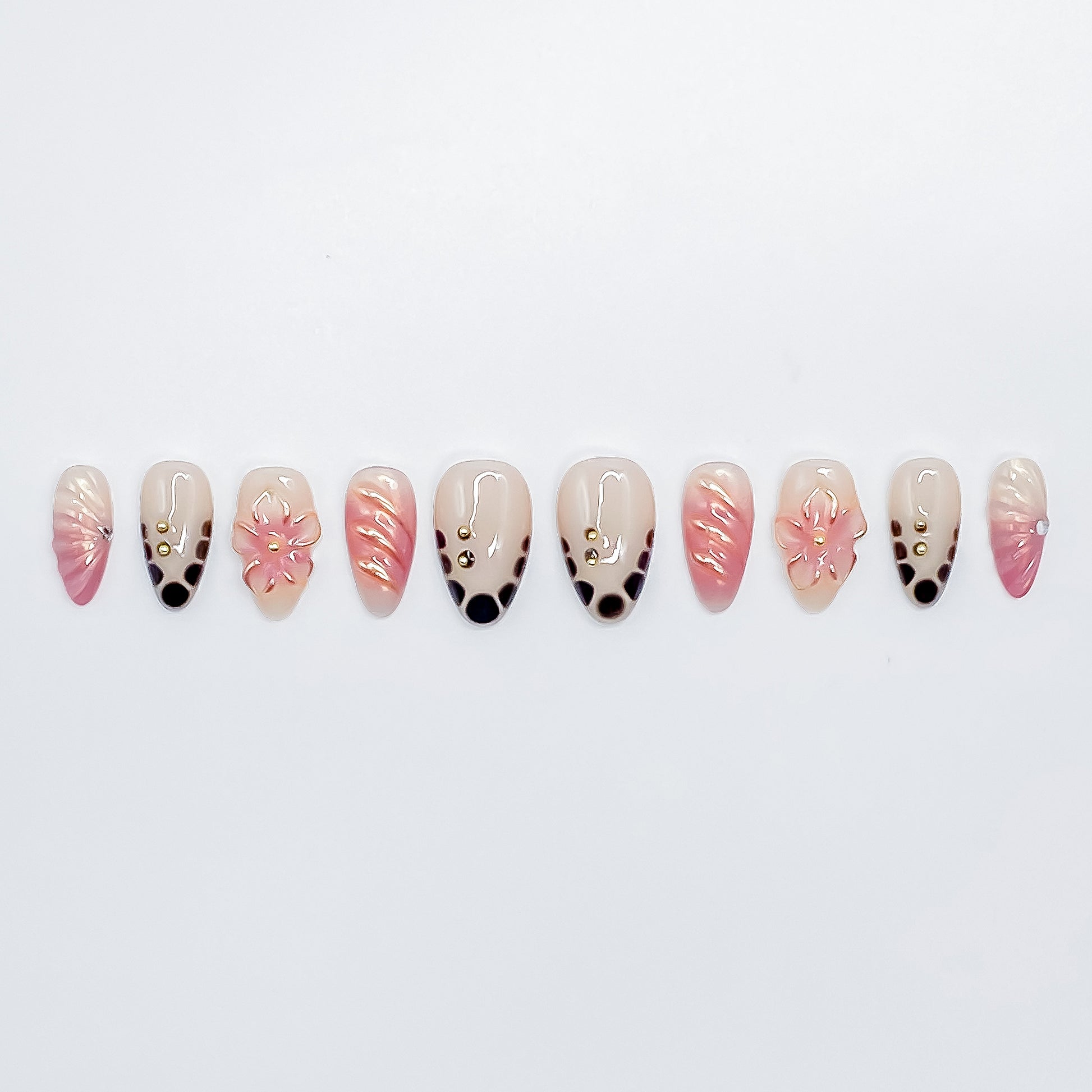 Introducing this elegant press - on nail set, a perfect mix of charm and artistry. With a stiletto shape, these nails feature soft nude, pink, and delicate black accents. Some nails have 3D pink flowers with gold centers, while others showcase gold - lined patterns and black dot details. There are also nails with a pink gradient and butterfly - like designs. The glossy finish adds a touch of luxury. Ideal for those who love a feminine and detailed style, it brings a romantic and sophisticated vibe to any look.